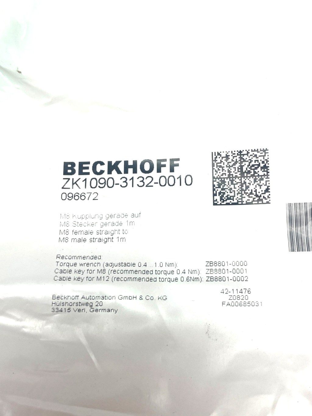 Beckhoff ZK1090-3132-0010 Double Ended EtherCAT Power Cable M8 4-Pin 1m 096672