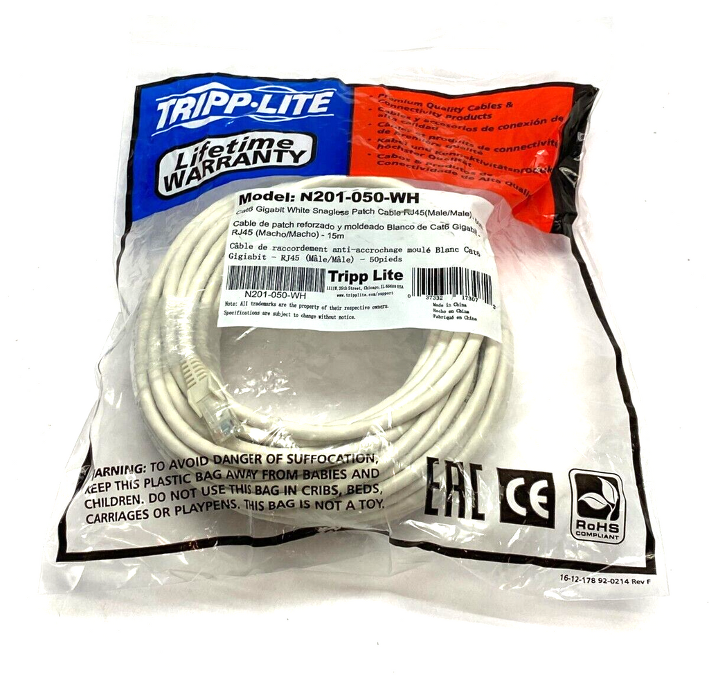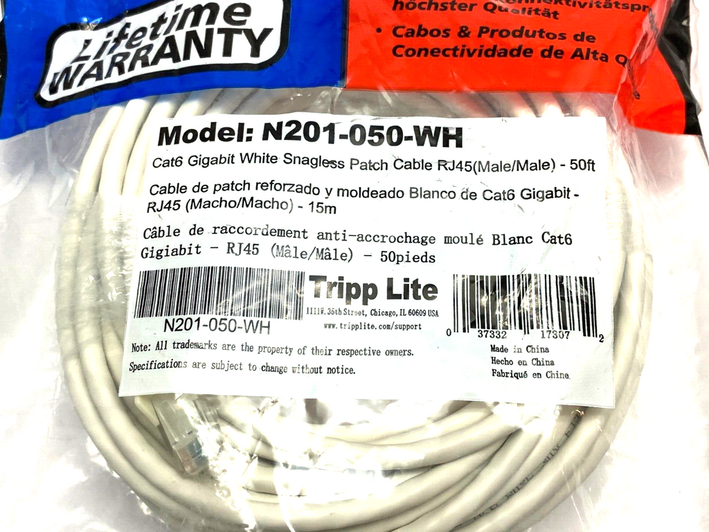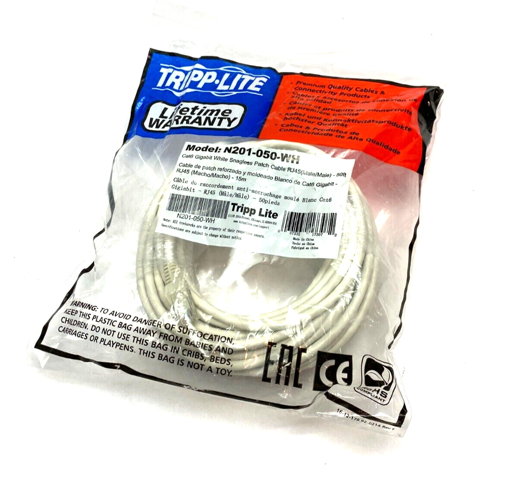 Tripp Lite N201-050-WH Cat6 Gigabit White Snagless Patch Cable RJ45 M to M 50ft