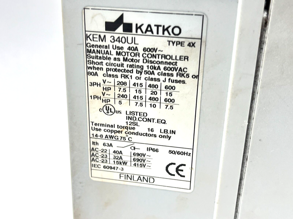 Katko KEM 340UL Manual Motor Controller Type 4X 40A 600VAC