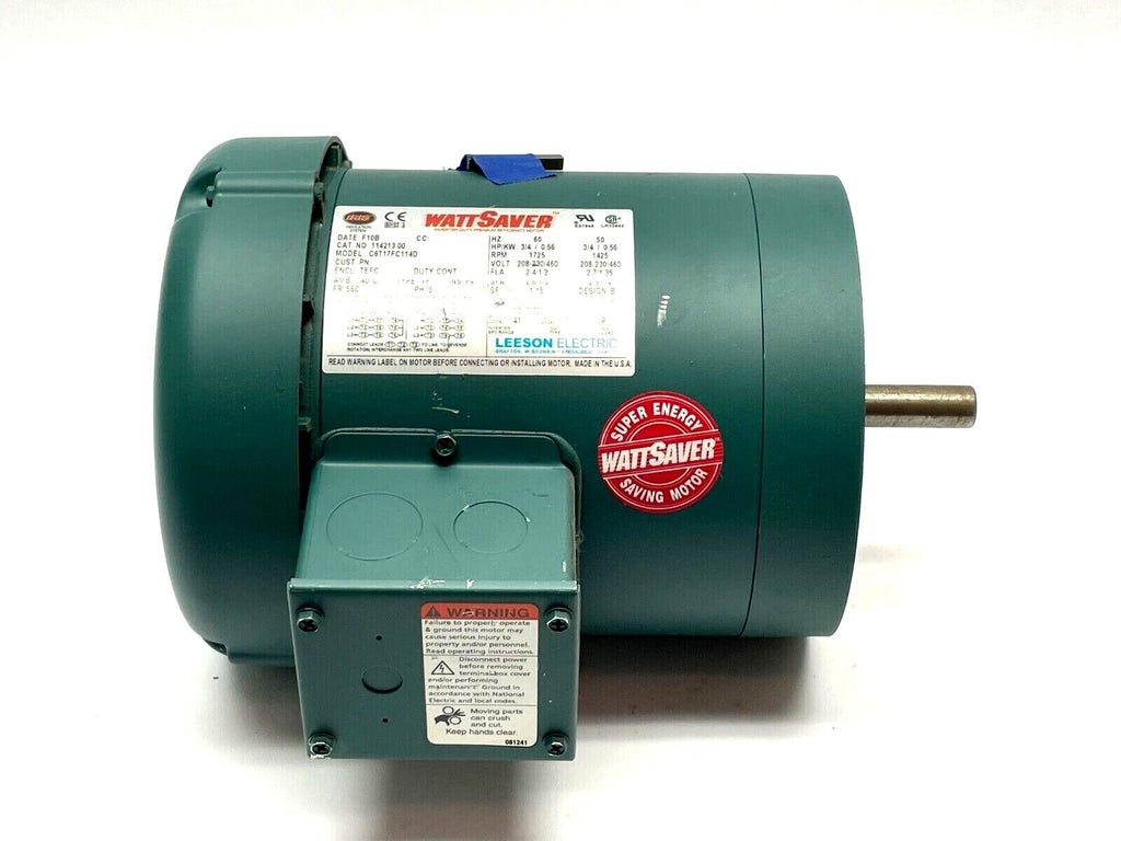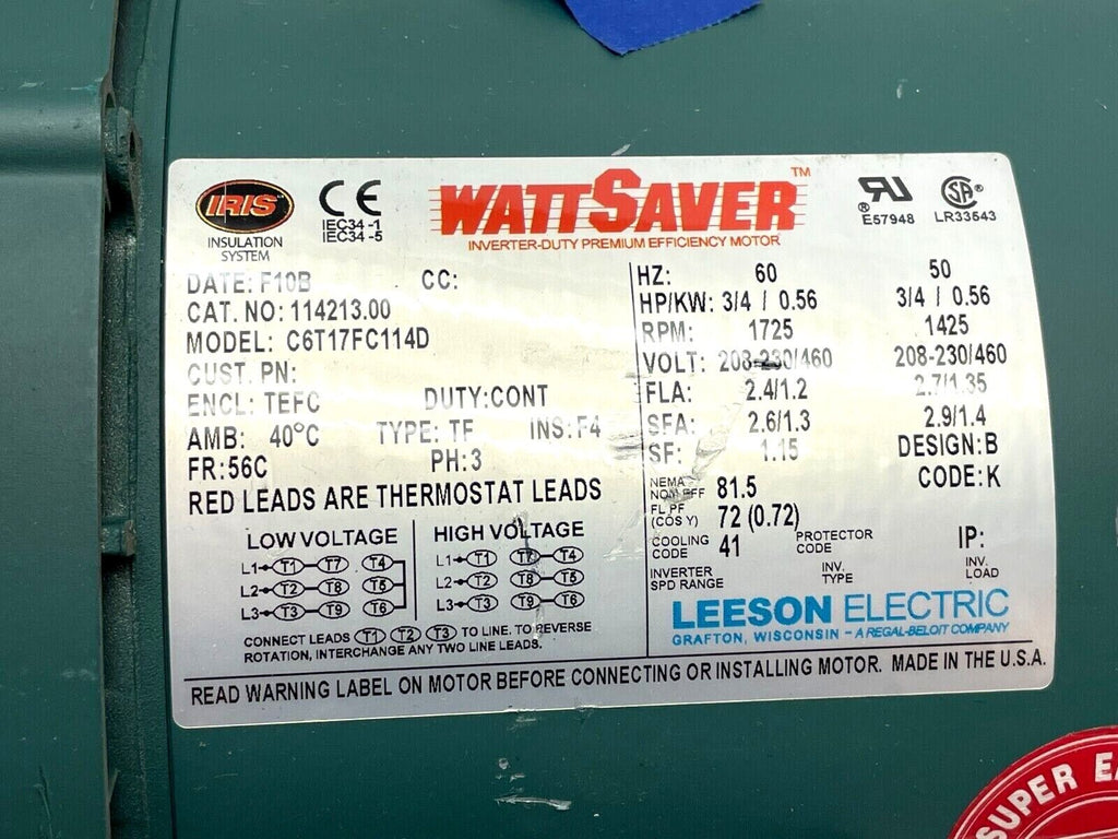 Leeson 114213.00 Electric Motor 3/4HP 1725RPM 3PH 5/8" Shaft C6T17FC114D