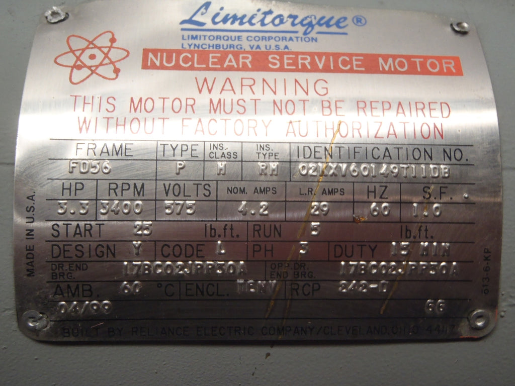 Limitorque 02KXV60149T11DB Nuclear Service Motor 3.3HP 3400RPM 575V 4.2A
