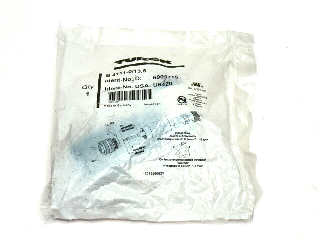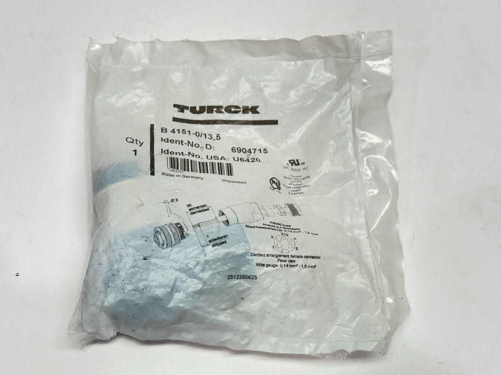 Turck B 4151-0/13,5 Field Wireable Connector 7/8" Female Straight 5-Pin U6420
