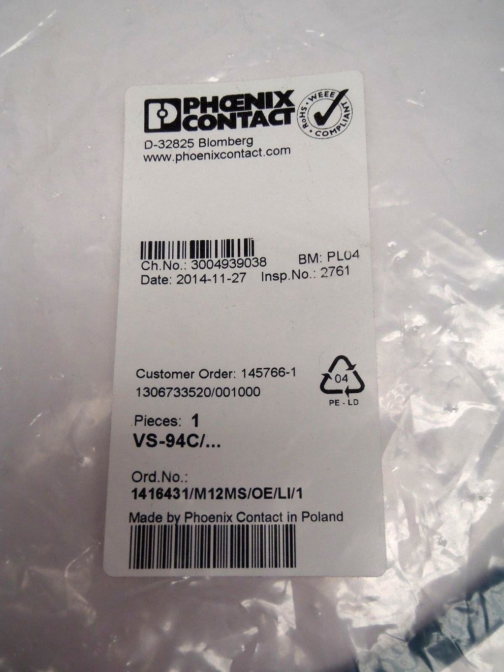 Phoenix Contact VS-94C/... Bus System Ethernet Cable 1416431