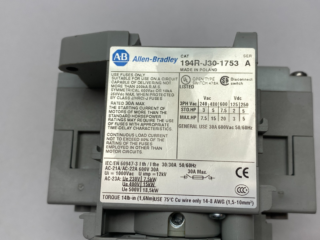 Allen Bradley 194R-J30-1753-PYN1 Ser. A Disconnect Switch, 194R-N1, 194R-PY