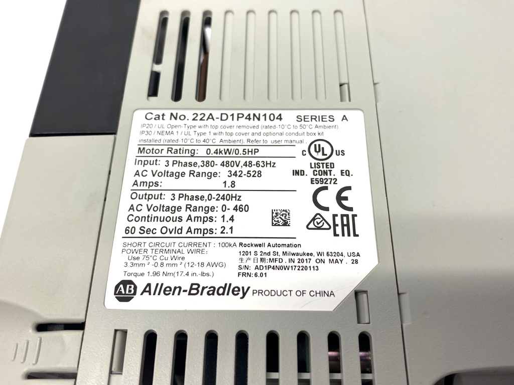 Model: Ser. A PowerFlex 40 AC Drive, 0.4kW, 0.5HP, 380-480V