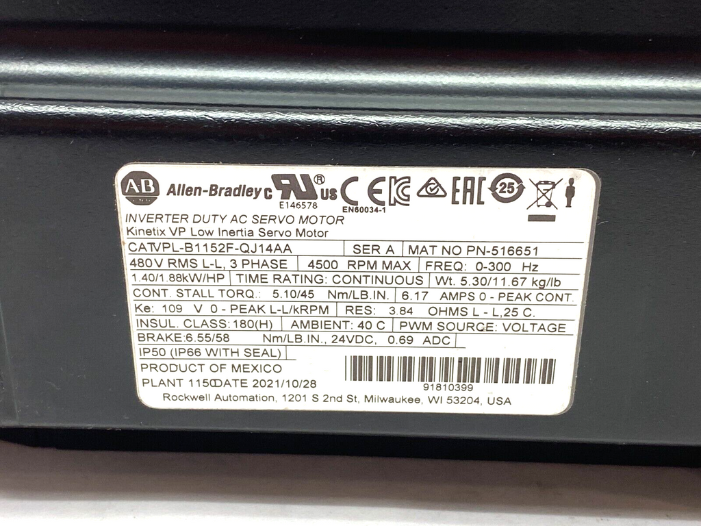 Allen Bradley VPL-B1152F-QJ14AA Ser A Kinetix VP Low Inertia Inv AC Servo Motor