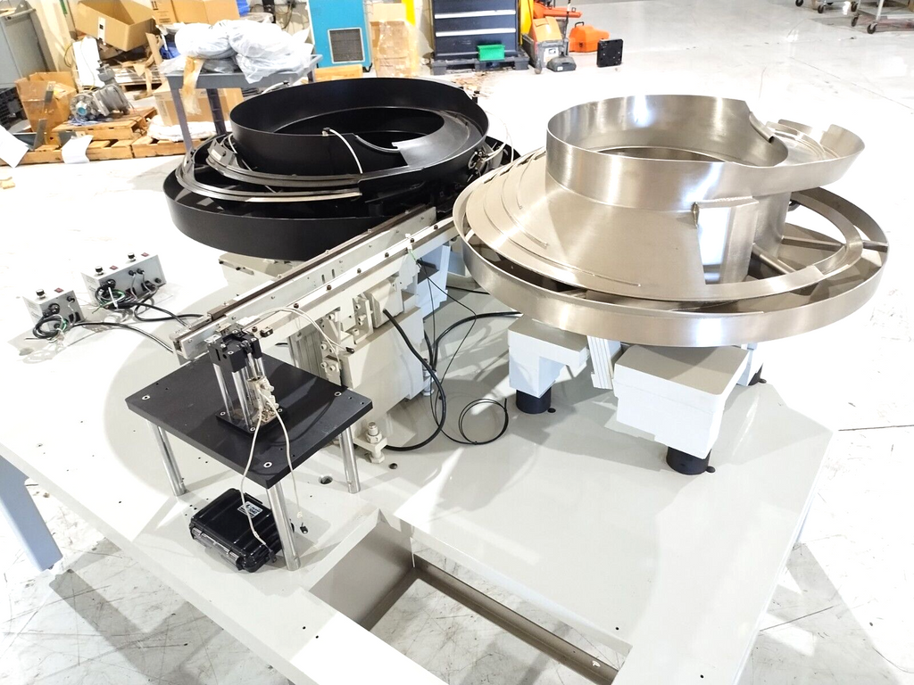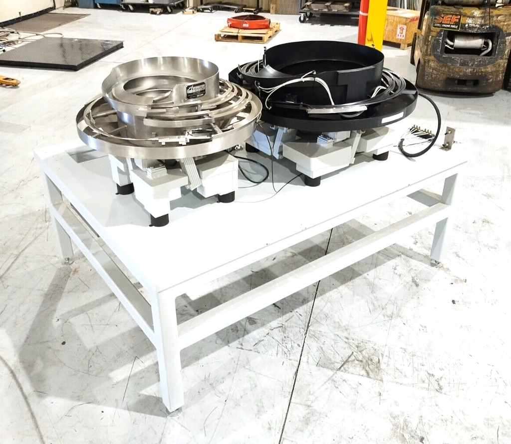 Automation Feed Systems Vibratory Bowl Feeder Table, Two Bowl Unit 24" & 18" 10A - Used