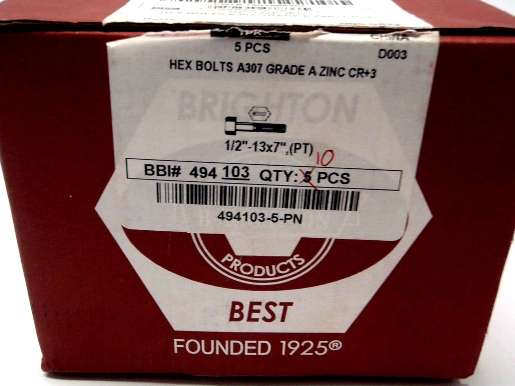 Brighton Best 494 103 1/2"-13x7" Hex Bolts A307 Grade A Zinc CR+3 LOT OF 10