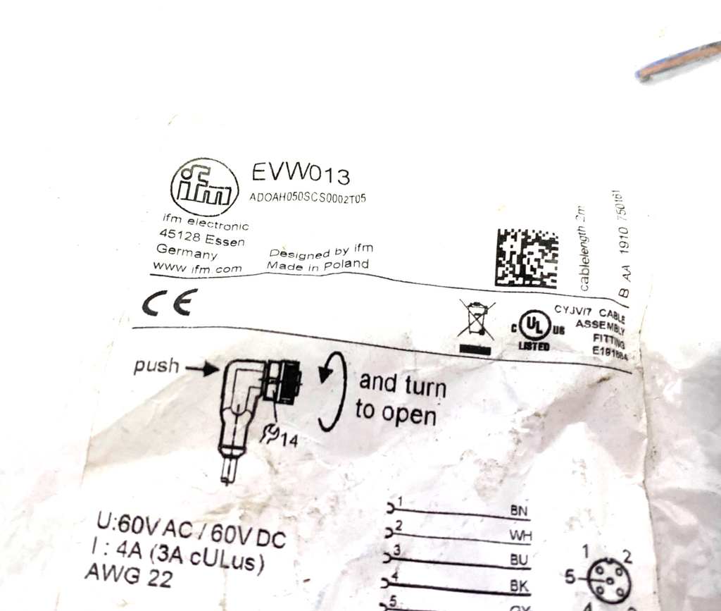 EVW013 | Ifm Right Angle Female Cordset M12 2M Adoah050Scs0002T05 - New