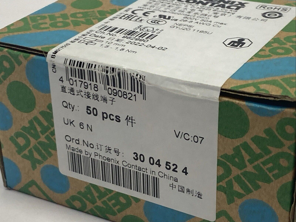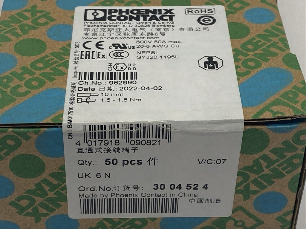 Phoenix Contact Typ UK 6 N Feed Through Terminal Block 3004524 PKG OF 50