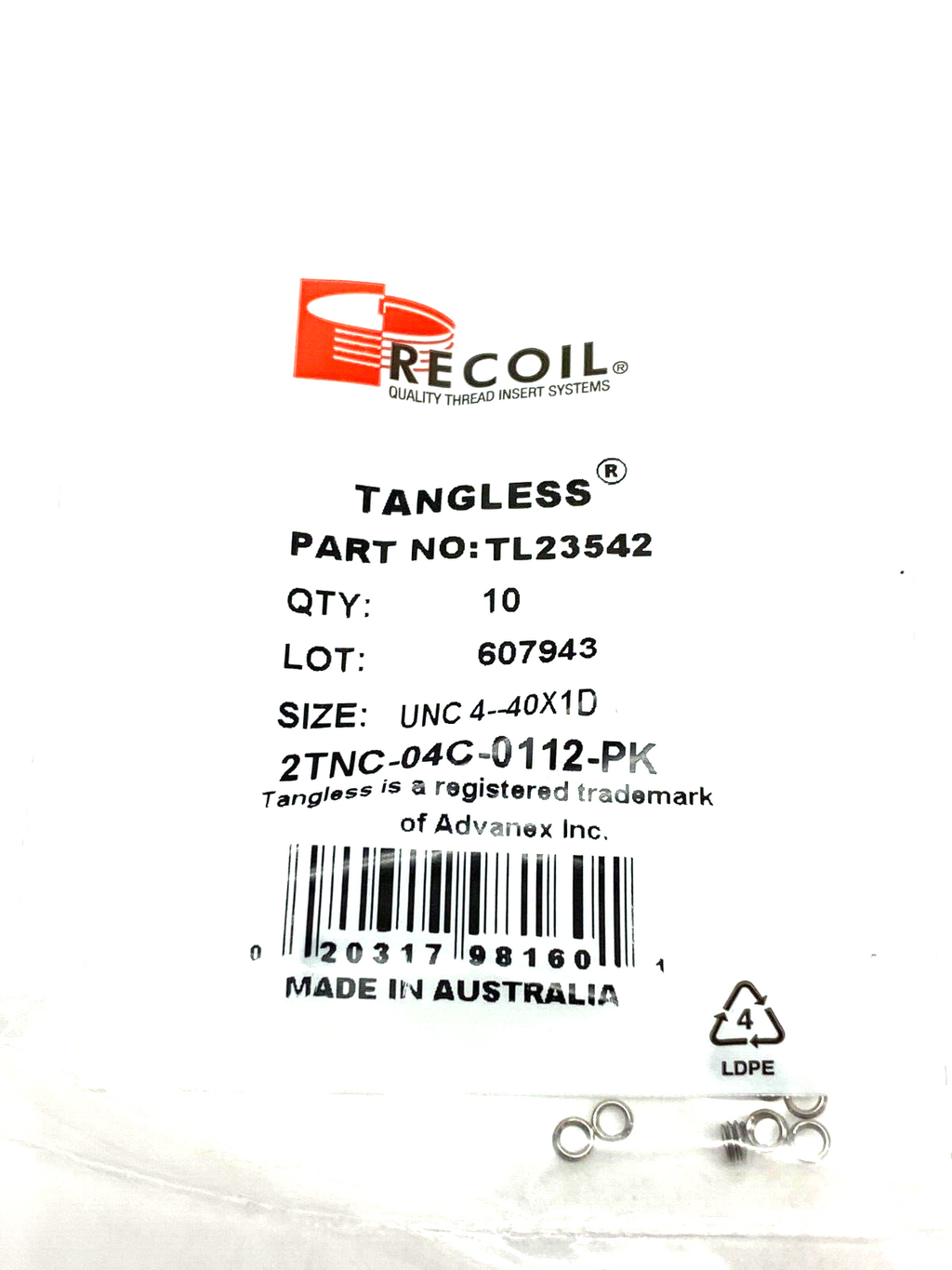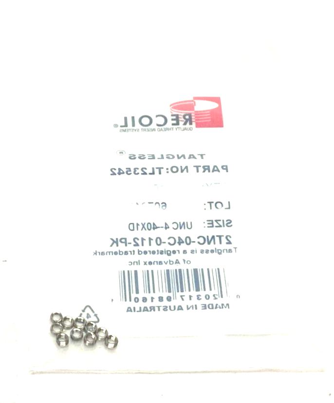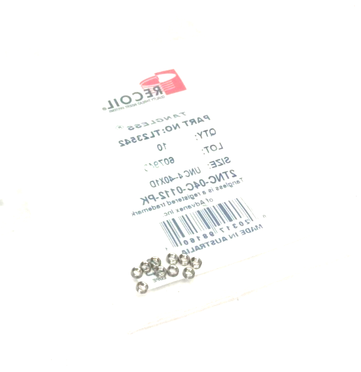 Recoil TL23542 Tangless Free Running Insert Size: UNC 4-40X1D 2TNC-04C-0112-PK
