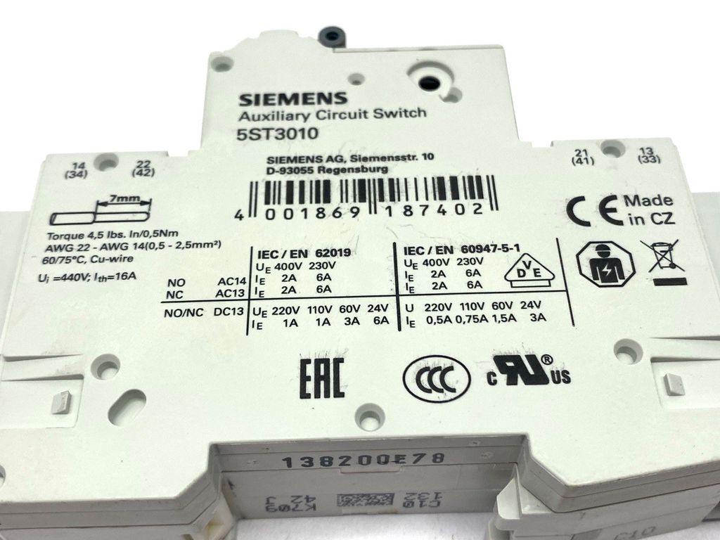 Siemens 5SJ4110-7HG42 Circuit Breaker 1P 10A w/ 5ST301 Auxiliary Switch