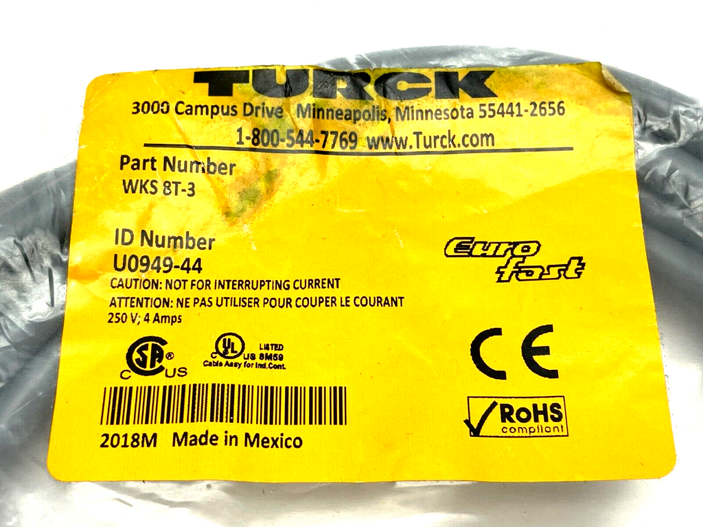 WKS 8T-3 | Turck Eurofast Single Ended Cordset Rt Angle 8-Pin 3m Length U0949-44 - New